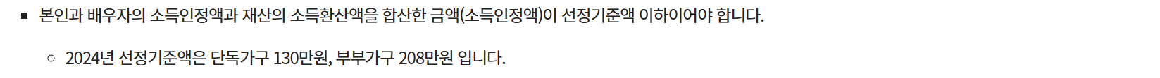 소득 요건: 가구의 소득인정액이 기준 중위소득의 일정 비율 이하일 것 소득인정액은 근로소득, 재산, 금융자산 등을 포함하여 산정되며, 매년 변경될 수 있습니다. 일반적으로 기초생활수급자, 차상위계층, 저소득층이 주요 수급 대상이 됩니다.