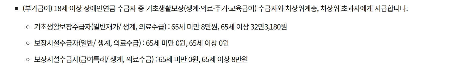 소득이 낮은 중증 장애인을 대상으로 매월 일정 금액을 지원하며, 이를 통해 최소한의 생계를 유지하고 사회 참여를 확대할 수 있도록 돕는 역할을 합니다.